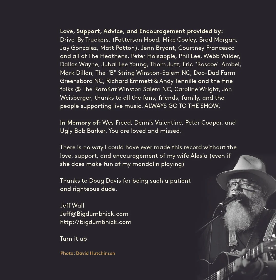 Drive-By Truckers, (Patterson Hood, Mike Cooley, Brad Morgan, Jay Gonzalez, Matt Patton), Jenn Bryant, Courtney Francesca and all of The Heathens, Peter Holsapple, Phil Lee, Webb Wilder, Dallas Wayne, Jubal Lee Young, Thom Jutz, Eric "Roscoe" Ambel, Mark Dillon, The "B" String Winston-Salem NC, Doo-Dad Farm Greensboro NC, Richard Emmett & Andy Tennille and the fine folks @ The RamKat Winston-Salem NC, Caroline Wright, Jon Weisberger, Marcos Harkness